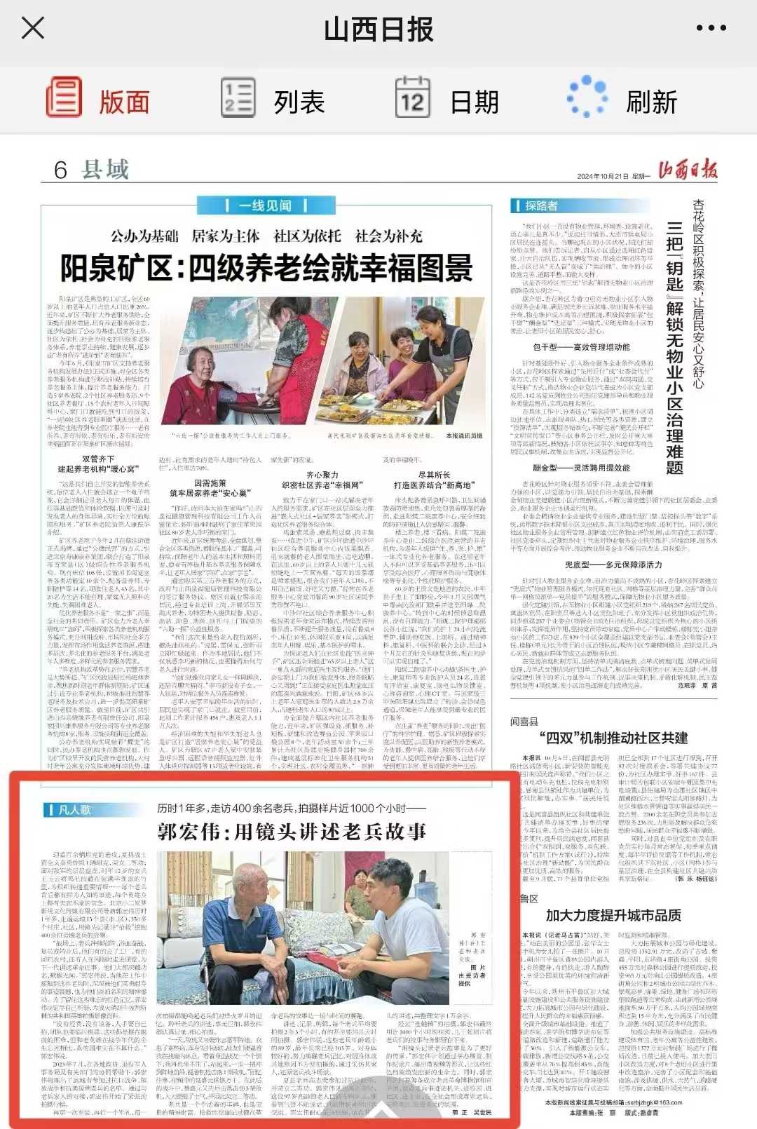 一年多来,在全市政协、全市退役军人事务部门及各县(市、区)融媒体中心等大力支持下,郭宏伟深入各县(市、区),走访拍摄这些老兵。老兵的故事、老兵的荣誉、老兵的精神、老兵的家风……犹如一道道光芒穿透历史的云烟,熠熠生辉。