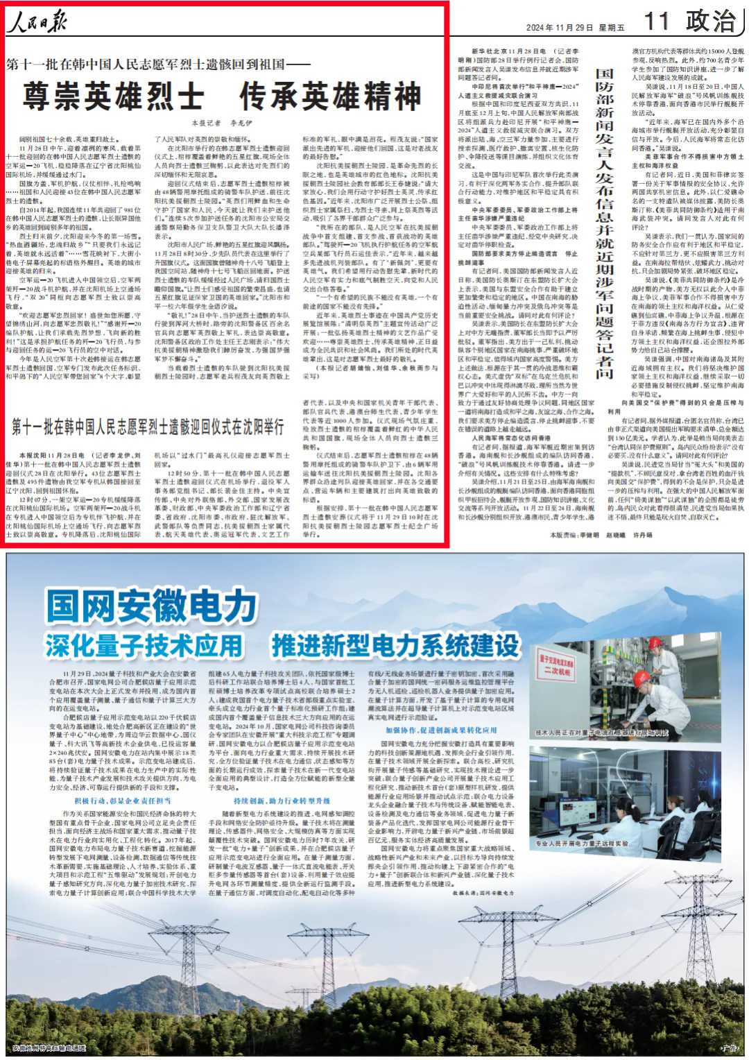 沈阳市人民广场,鲜艳的五星红旗迎风飘扬。11月28日8时30分,少先队员代表在这里举行了升国旗仪式。这面国旗曾随神舟十八号飞船登上我国空间站,随神舟十七号飞船返回地面。护送烈士遗骸的车队缓缓经过人民广场,请归国烈士瞻仰国旗。“让烈士们感受祖国的繁荣昌盛,也请五星红旗见证保家卫国的英雄回家。”沈阳市和平一校六年级学生金语汐说。