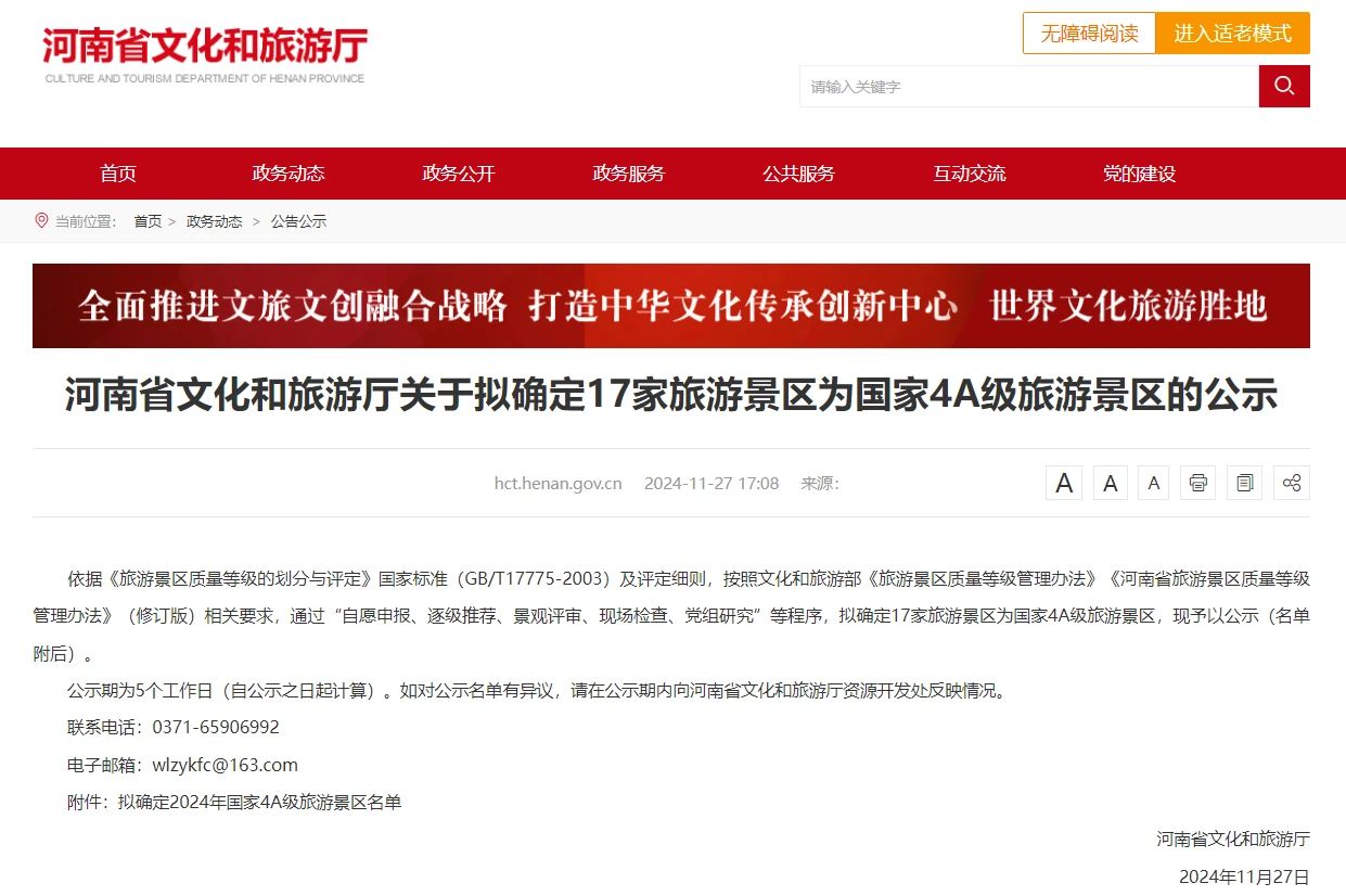 公告显示,依据《旅游景区质量等级的划分与评定》国家标准(GB/T17775-2003)及评定细则,按照文化和旅游部《旅游景区质量等级管理办法》《河南省旅游景区质量等级管理办法》(修订版)相关要求,通过“自愿申报、逐级推荐、景观评审、现场检查、党组研究”等程序,拟确定17家旅游景区为国家4A级旅游景区。