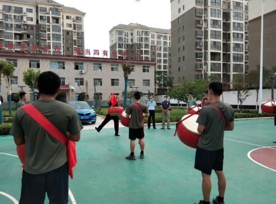 开封盘鼓是河南省开封市特有的一种传统鼓乐表演艺术,与安徽凤阳花鼓、山西威风锣鼓、陕西安塞腰鼓、甘肃太平鼓并称为“中华五鼓”, 起源于古代军队中的讶鼓。击之如雷,动之如涛,鼓中有舞,舞中有鼓极富感染力,十分适合部队战士业余文化活动需求。打鼓看起来简单好看,也是个体力活,很锻炼身体。开封盘鼓省级代表性传承人王国海老师喊着“跳跃时幅度要大,整个人打开,才能舞出气势!自己纵身跃起,鼓槌呈“八”字捶向腰间大鼓,脚刚一着地,人再度跃起,脸部青筋暴露,喉咙气力迸发。战士们上前跨步、跳跃,双臂上扬,大力捶击,顷刻巨雷般的鼓声。