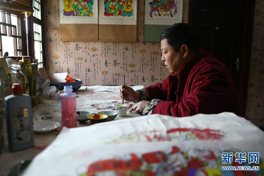 1月19日,开封市朱仙镇的年画艺人在创作年画。