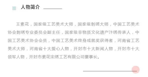 从1957年进入开封汴绣厂,从事汴绣60余年,王素花在汴绣艺术传承和创新发展方面取得了巨大成就。1995年被联合国教科文组织、中国民协联合授予“中国民间工艺美术家”称号;2003年荣获“河南省工艺美术大师”称号;2005年获得中国工艺美术最高荣誉——“中国工艺美术终身成就奖”;2007年被授予“中国民间文化杰出传承人”荣誉称号;2009年又被国务院命名为“中国非物质文化遗产(汴绣)代表性传承人”。