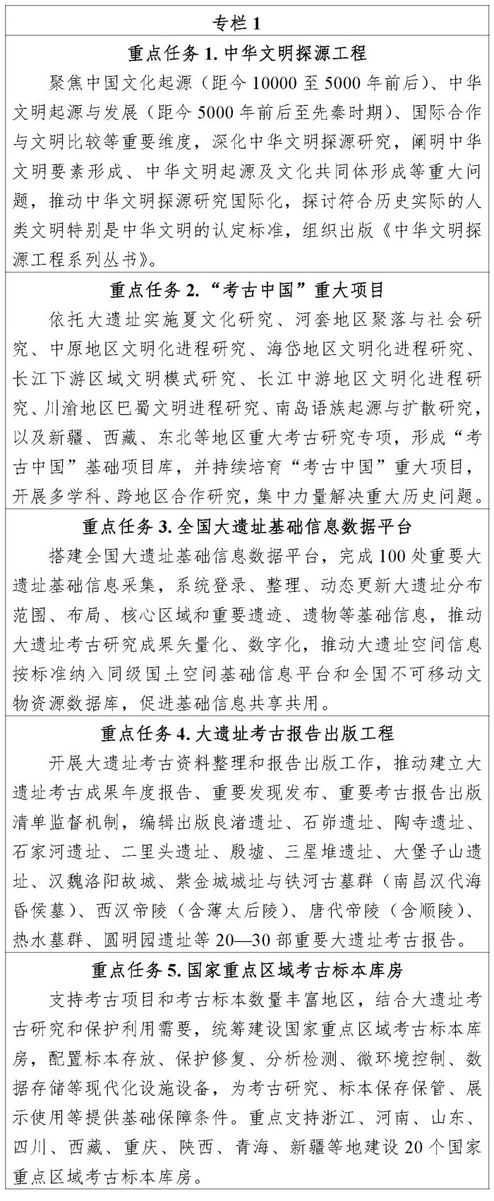 深入推进中华文明探源研究、“考古中国”重大项目,支持重要大遗址编制中长期考古工作计划,系统持续开展考古测绘、调查、勘探和发掘,搭建全国大遗址基础信息数据平台。实施考古报告出版工程,做好考古成果的挖掘、整理、阐释和国际传播工作。支持央地共建、省地共建、校地共建考古工作基地(站),建设20处国家重点区域考古标本库房,实现区域考古标本管理现代化、规范化。