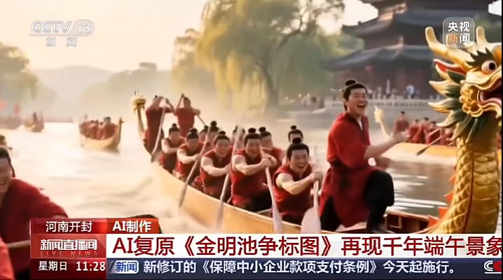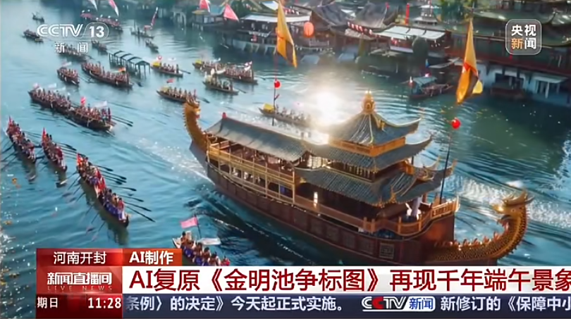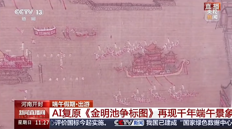 《金明池争标图》画幅虽然不大,却描绘出了1000多个人物,拉车人、商贩,玩杂耍的、放风筝的,个个生动鲜活又姿态各异。
