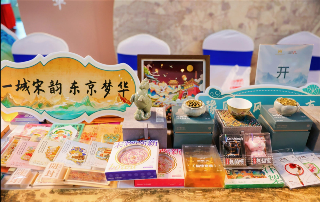 除了舞台上精彩迭出的戏剧演出,一旁的开封非遗文创互动体验区同样人头攒动、热闹非凡。鼓楼区的文创展台前,兼具历史厚重感与现代审美趣味的系列产品引得不少人驻足:王大昌茉莉花茶、开封小笼包挂件、汴绣书签等让人爱不释手。龙亭区则带来清明上河园、龙亭等标志性建筑为灵感设计的冰箱贴透着雅致古韵。示范区官瓷古朴,釉色独特;黄河泥陶质朴,尽显传统工艺魅力;汴绣针法细腻,绣品栩栩如生;楚记酱鸭酱香四溢,撩动味蕾;嚮搨技艺传承古老拓印之美。
