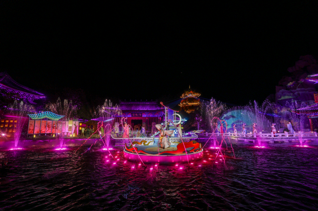 游船行进间,两岸四大主题园林步步皆景、处处有戏。龙亭湖中心舞台大型水上实景演出《泱泱宋潮》,通过龙舟争标、御宴簪花、雅集市井、瓦肆勾栏四幕剧情,再现了大宋繁华盛景。码头灯影、特色演艺船,断桥银丝古建一系列宫廷舞蹈器乐、古风杂技让游客沉浸式感受皇家乘船游园的氛围,品味千年宋韵。