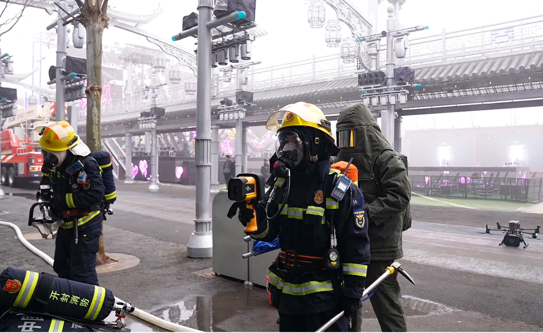 本次消防安全演练参与人数570余人,出动19辆消防车,3台雾油喷机,一台机器人车,10路单兵图传,4架无人机,3套无线自组网设备及部分灯光、音响、视频设备。