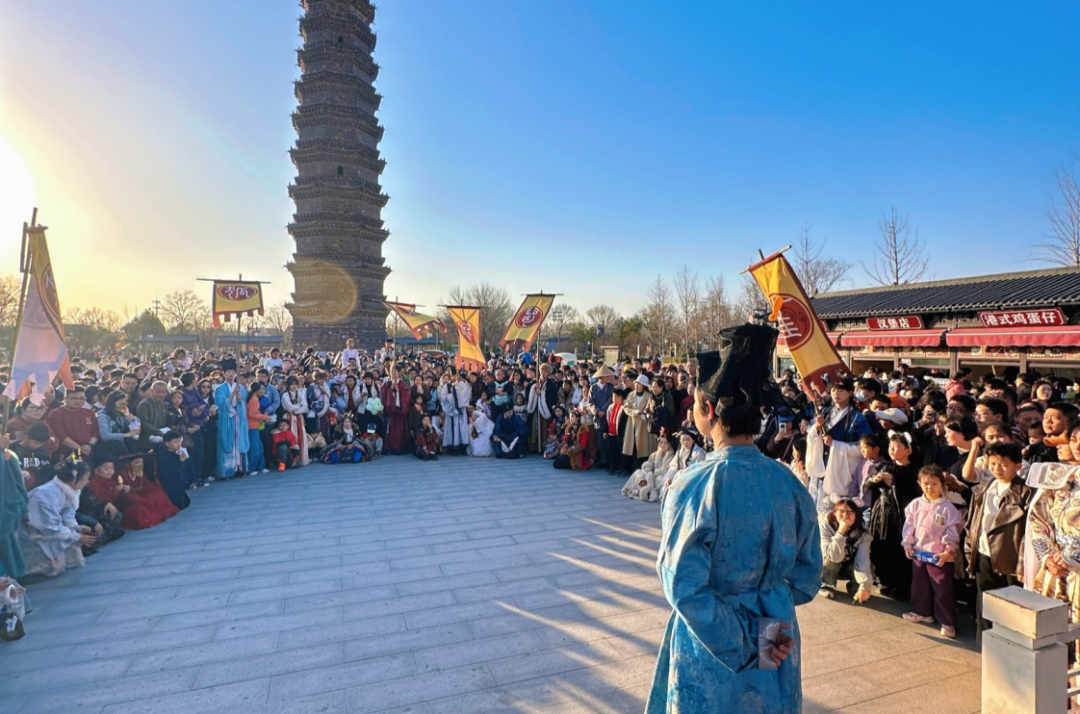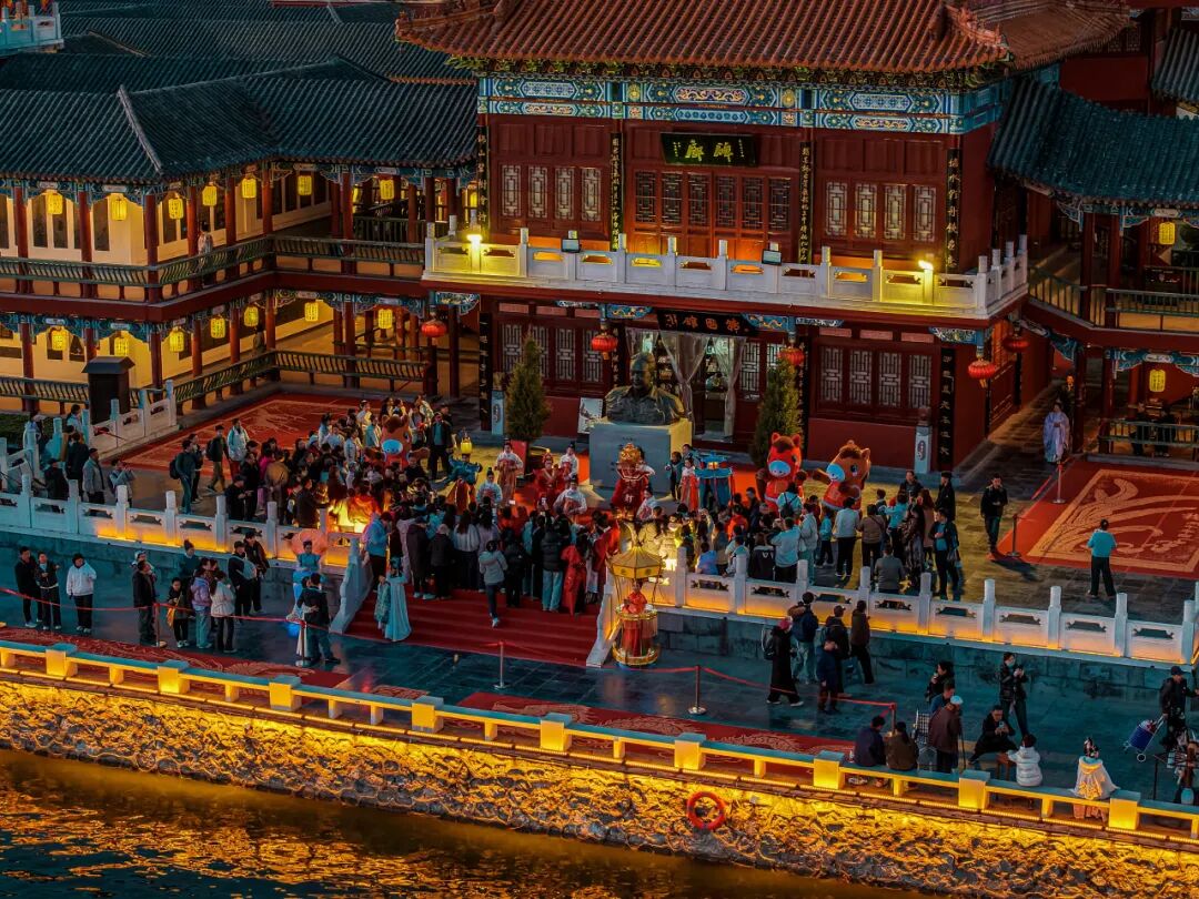 白日里,祭祖大典传承人文精神;“金马贺新”乐队中西合奏燃动全场;豫剧《唐伯虎书画》融合书画;《如梦令》《桃叶渡》等沉浸式剧目在亭台水榭间轮番登场。吹玻璃、剪纸、面塑、吹糖人等传统技艺齐聚非遗市集。焚香、插花、点茶、拓片、金砖练字等宋韵雅事体验让游客触碰文化温度。