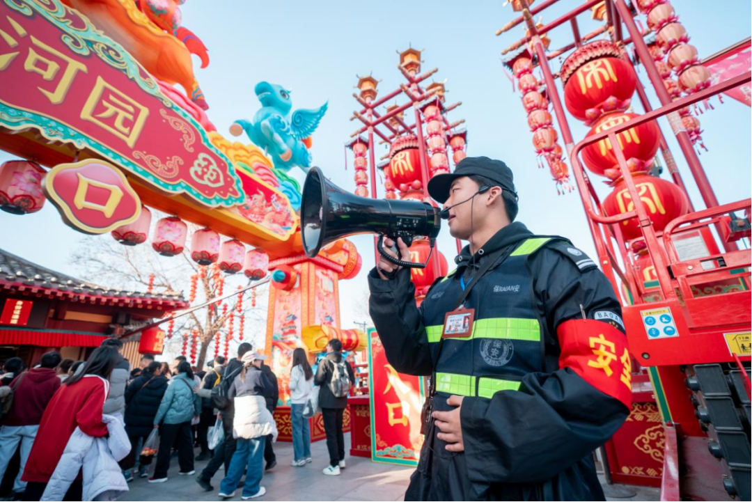 针对春节假期客流高度集中的情况,清明上河园加大安保,构建全方位立体防控网,特别是在热门表演区域和游客打卡点加强巡逻值守,切实维护人民群众生命财产安全。