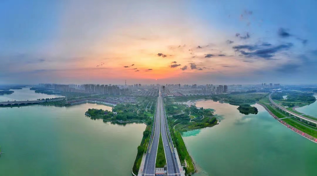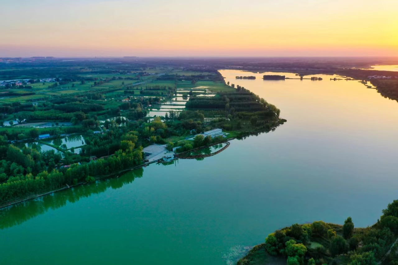 迎着朝霞,从空中俯瞰黑岗口调蓄水库,树木郁郁葱葱,水面碧波荡漾。这里景色优美,是假日休闲放松的好去处。