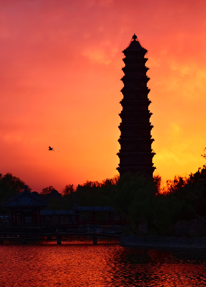 当夕阳的余晖洒落在开封铁塔上,这座古老的建筑仿佛被披上了一层金色的纱衣,更显庄重而神秘。