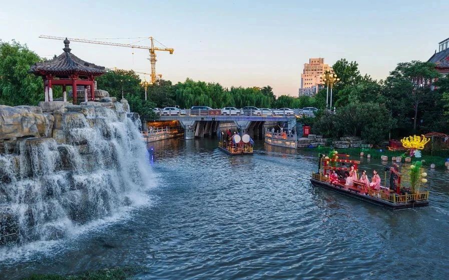 大型水上实景演出“泱泱宋潮”以龙舟争标的激昂场景开篇,至八方争奏彰显开放包容的文明对话收束,将大宋王朝的盛世风华浓缩于水光潋滟之间。