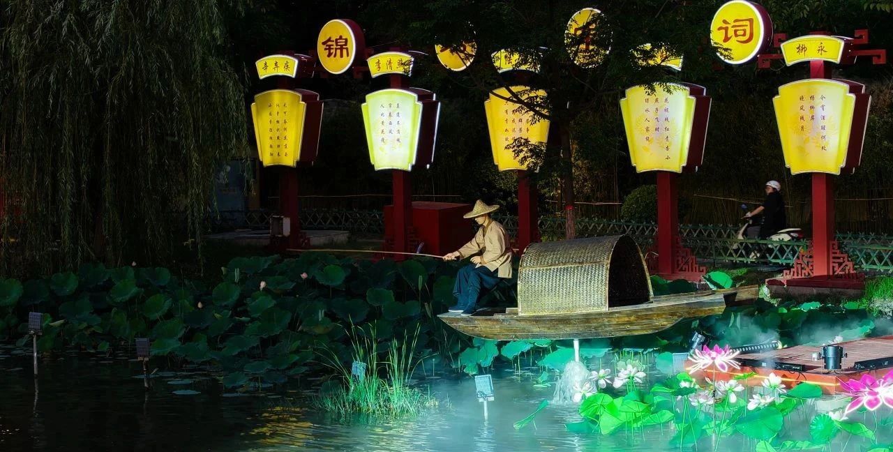 春花园的沐春舞影和扬琴舞韵,夏荫园的鱼灯、踏青和杂技(顶缸、空竹),秋韵园的宋词乐舞和冬凝园的戏曲、百戏图、侠女、剑客和渔翁,坐在船里看两岸演艺,结合四季主题景观,宛如过了一个四季。