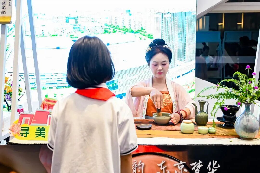 开封展台前,身着宋服的工作人员优雅的演示着宋代点茶技艺,茶香袅袅间,游客在非遗老师的指导下提笔写下“宋茶”,体验宋人风雅日常。