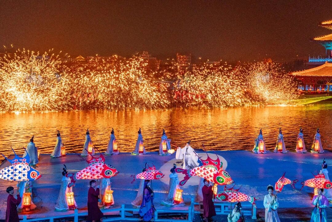 启动环节以“华灯”为核心载体,台上巨龙龙船腾起,台下鱼灯、龙灯次第点亮,沉浸式游园也应声启幕,生动还原了北宋上元夜 “凤箫声动,玉壶光转,一夜鱼龙舞”的繁华景象。