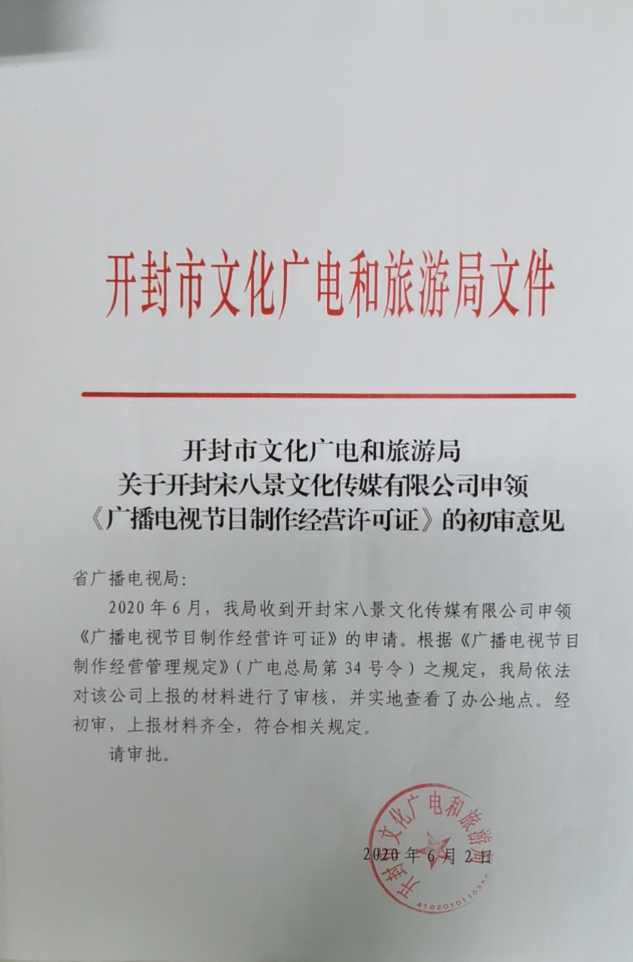关于开封宋八景文化传媒有限公司申领《广播电视节目制作经营许可证》的初审意见