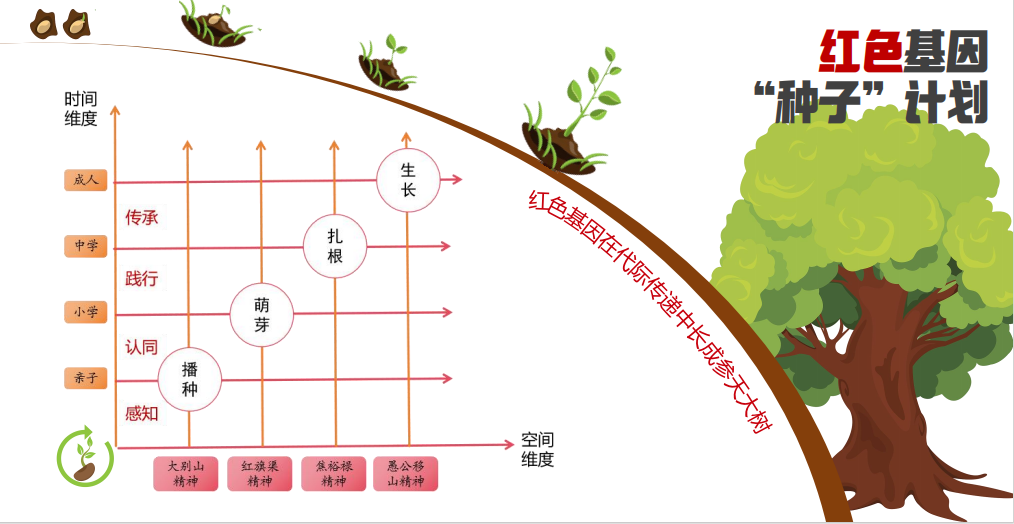 为此,项目创新提出 “红色基因种子计划”,将研学者视为“精神园丁”,每个课程以主线任务为牵引,通过在不同红色场域的沉浸式学习,经历“播种信念、萌芽奋斗、扎根为民、生长传承”四段式培育,让红色基因如种子般在广大青少年心中生根发芽、茁壮成长。