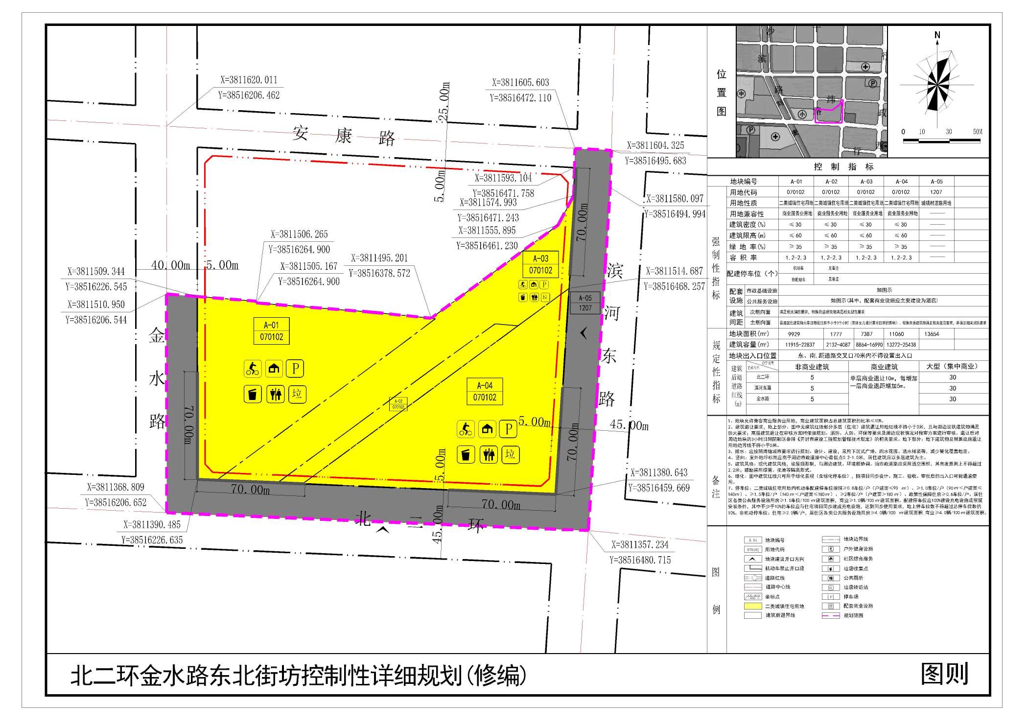 北二环金水路东北街坊位于北二环与滨河东路交叉口西北,因地块用地边界不规整,建筑限高不一致,现拟修编该区域内三个地块的建筑限高统一调整为不高于60米,容积率按照按照三块地指标综合计算。详见附图“北二环金水路东北街坊控制性详细规划(图则)”、“北二环金水路东北街坊控制性详细规划(修编)”。