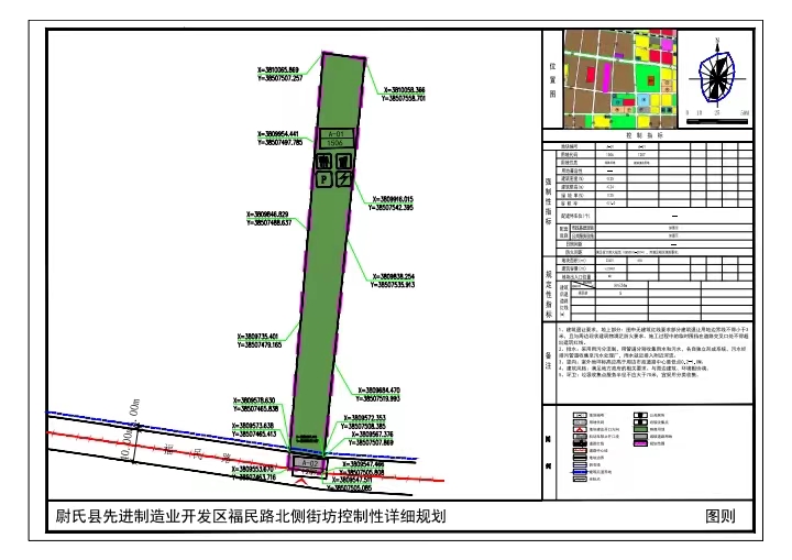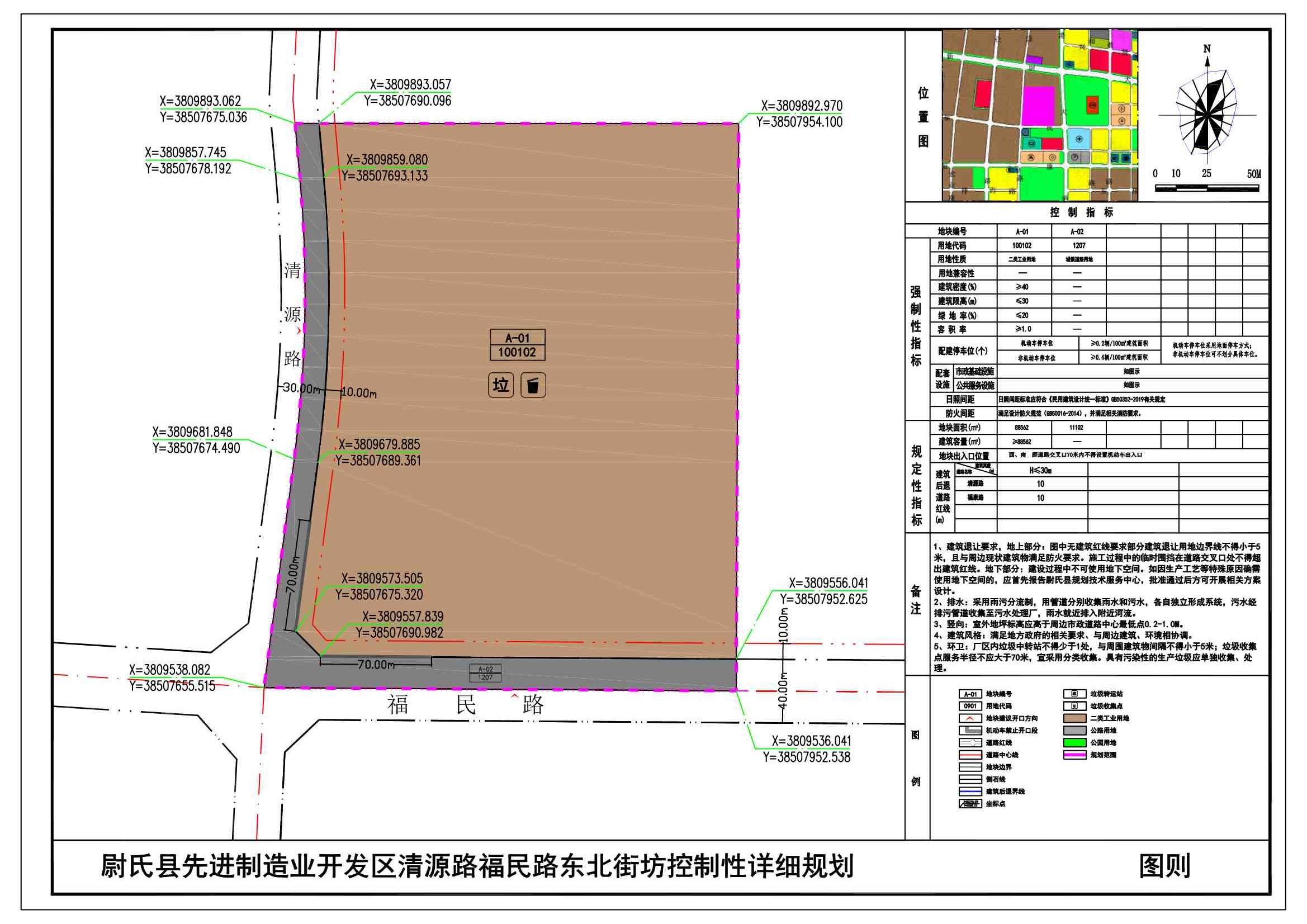 尉氏县先进制造业开发区清源路福民路东北街坊位于尉氏县先进制造业开发区清源路福民路交叉口东北,规划范围内用地性质为二类工业用地、城镇道路用地。详见附图“尉氏县先进制造业开发区清源路福民路东北街坊控制性详细规划(图则)”。