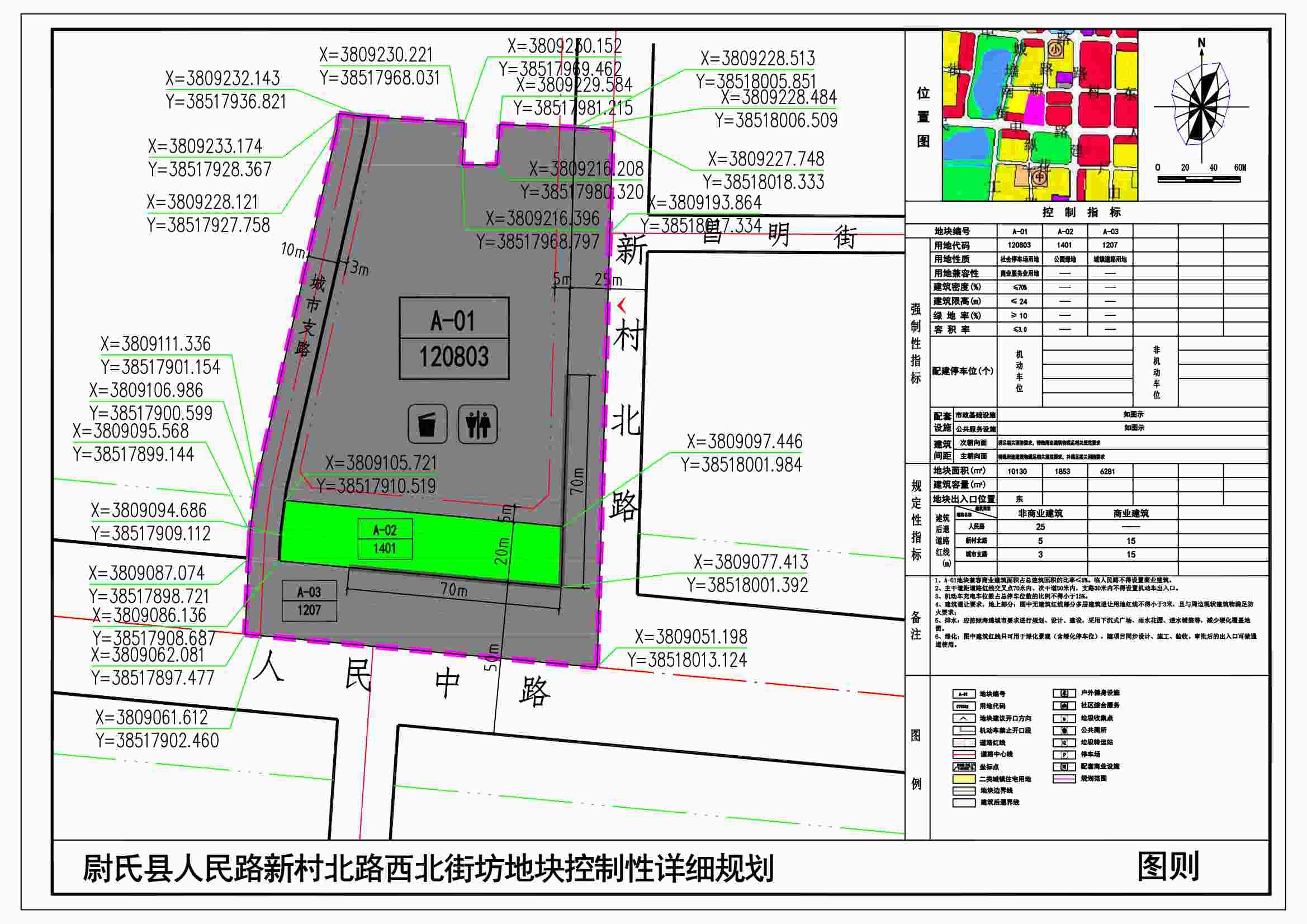 尉氏县人民路新村北路西北街坊位于尉氏县城人民路新村北路交叉口西北,规划范围内用地性质为社会停车场用地、公园绿地、城镇道路用地。详见附图“尉氏县人民路新村北路西北街坊控制性详细规划(图则)”。