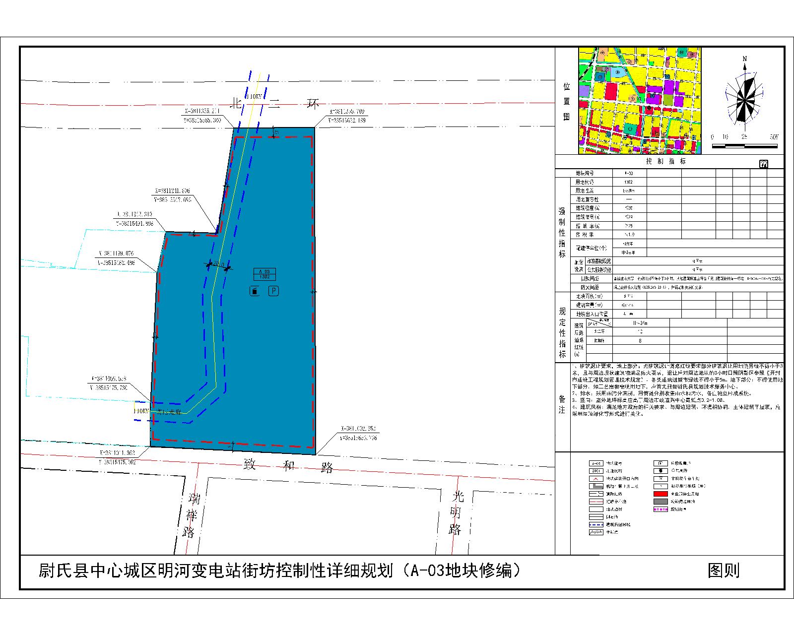 尉氏县中心城区明河变电站街坊A-03地块位于尉氏县北二环北、明河变电站东,原用地性质为其他公用设施用地,现拟修编该地块用地性质为排水用地,其他指标不变,详见附图“尉氏县中心城区明河变电站街坊控制性详细规划(A-03地块修编) 图则”。