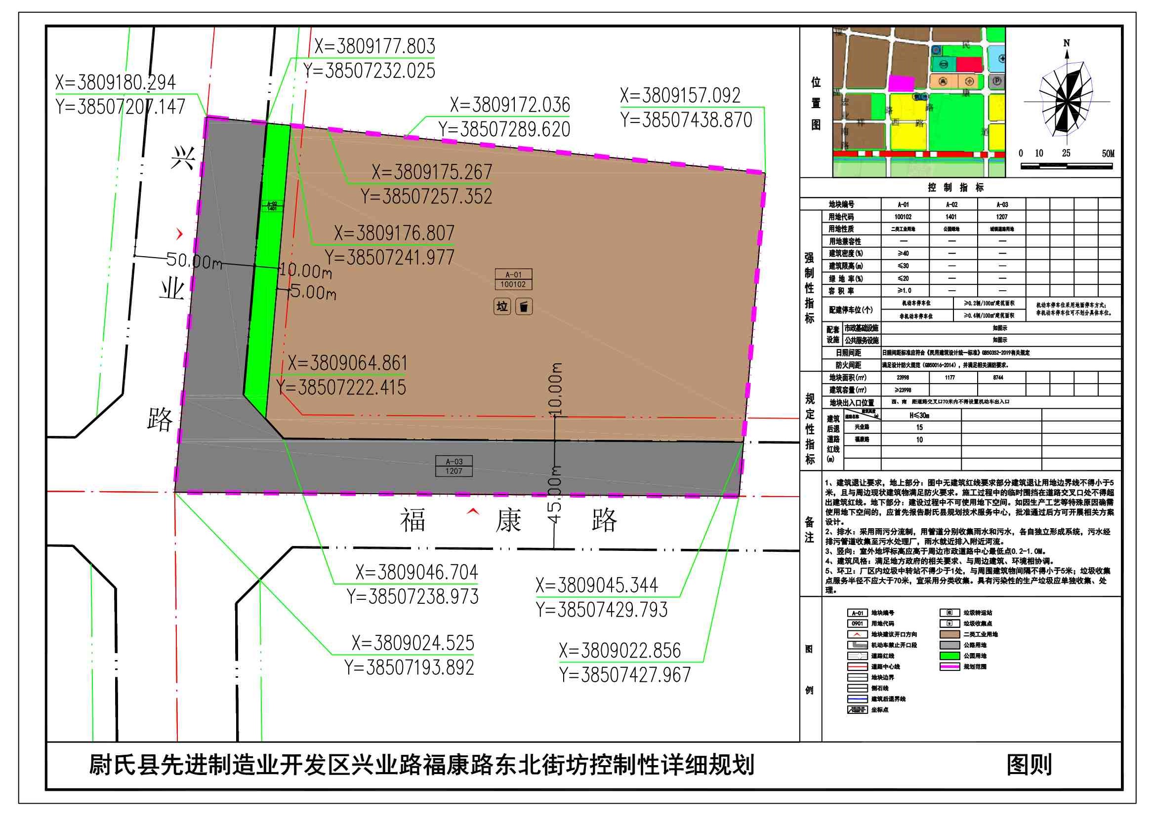尉氏县先进制造业开发区兴业路福康路东北街坊位于尉氏县先进制造业开发区兴业路福康路交叉口东北,规划范围内用地性质为二类工业用地、公园绿地、城镇道路用地。详见附图“尉氏县先进制造业开发区兴业路福康路东北街坊控制性详细规划(图则)”。