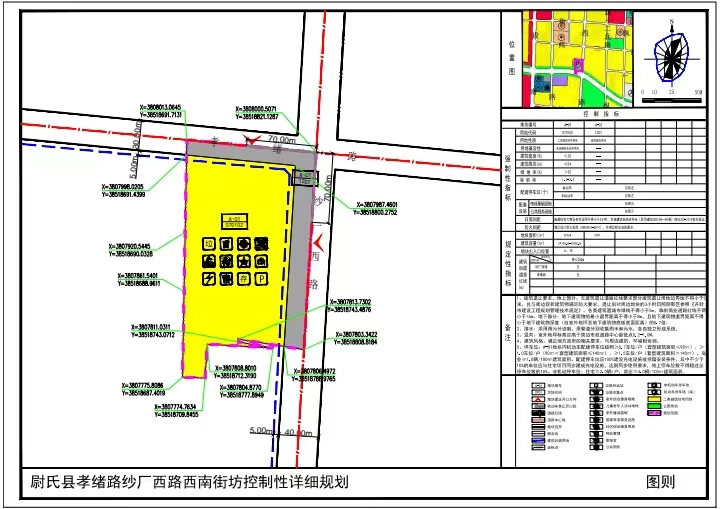 孝绪路纱厂西路西南街坊位于尉氏县城孝绪路与纱厂西路交叉口西南,规划范围内用地性质为二类城镇住宅用地(兼容商业服务业设施用地)、城镇道路用地。详见附图“孝绪路纱厂西路西南街坊控制性详细规划(图则)”。