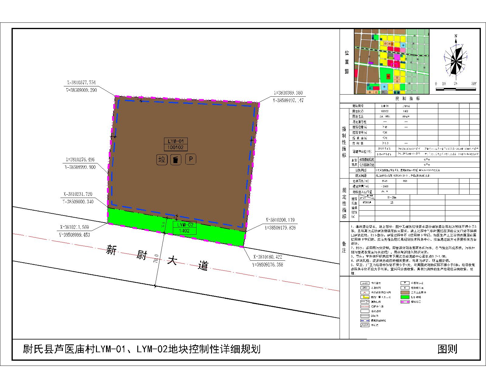 尉氏县芦医庙村LYM-01、LYM-02地块位于尉氏县先进制造业开发区卢医庙村、新尉大道北侧,规划范围内用地性质为二类工业用地、防护绿地。详见附图“尉氏县芦医庙村LYM-01、LYM-02地块控制性详细规划(图则)”。