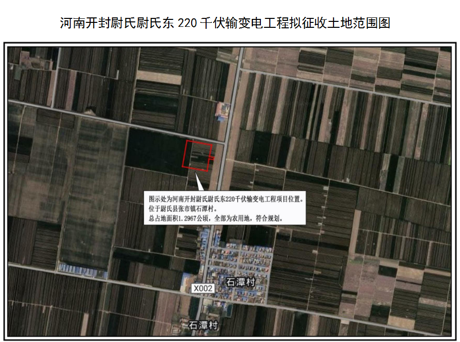 拟征收范围为尉氏县张市镇石潭村。四至范围:东至县道032、北至农村道路、西至用地边界、南至用地边界。具体范围以土地勘测定界为准。(附件拟征收范围图)。