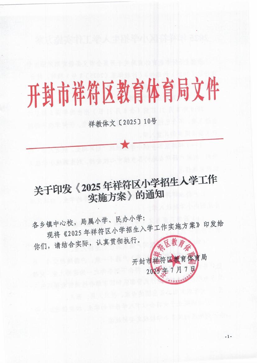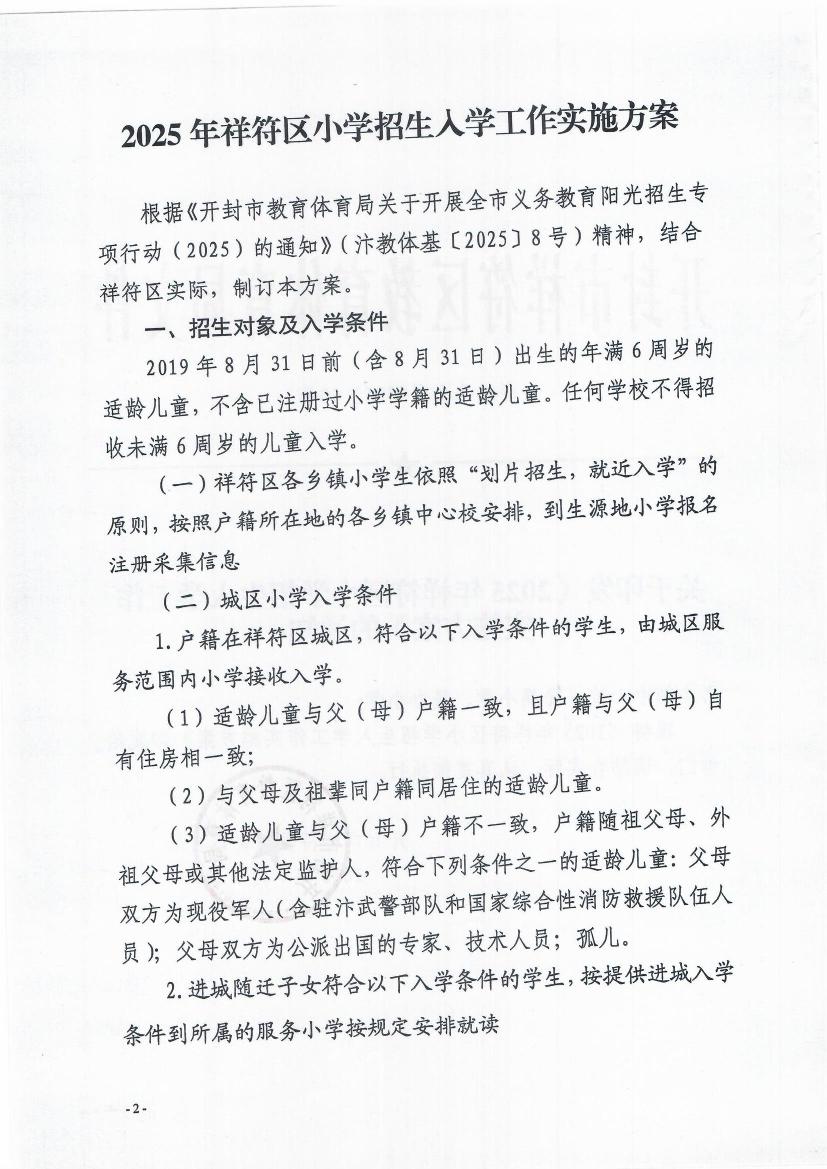 关于印发《2025年祥符区小学招生入学工作实施方案》的通知