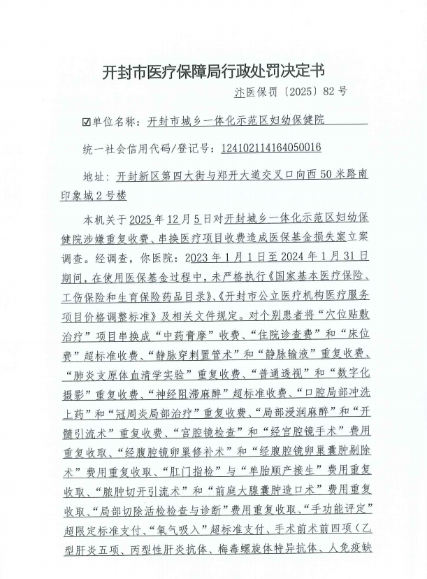 开封市医疗保障局行政处罚决定书 汴医保罚〔2025〕 82号