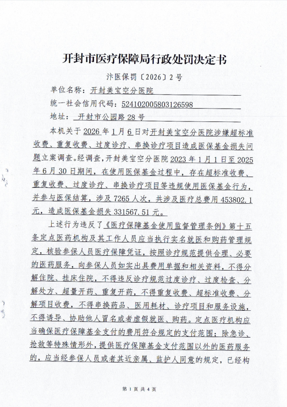 开封市医疗保障局行政处罚决定书 汴医保罚〔2026〕2号