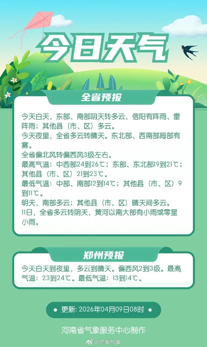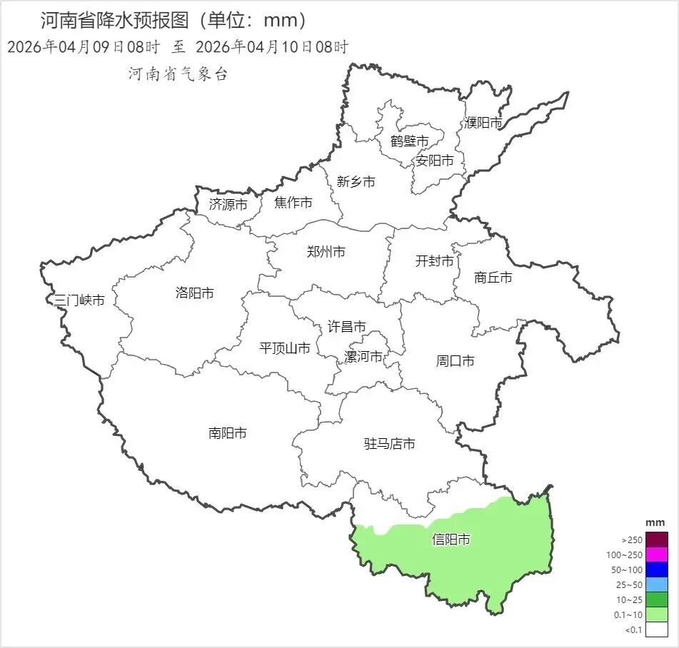 4月8日7时至9日7时,我省大部出现小到中阵雨、雷阵雨,黄河以北和洛阳北部、郑州、开封西部、平顶山南部、漯河、南阳、驻马店北部、信阳等地部分县(市、区)出现大雨,其中信阳局地出现暴雨。