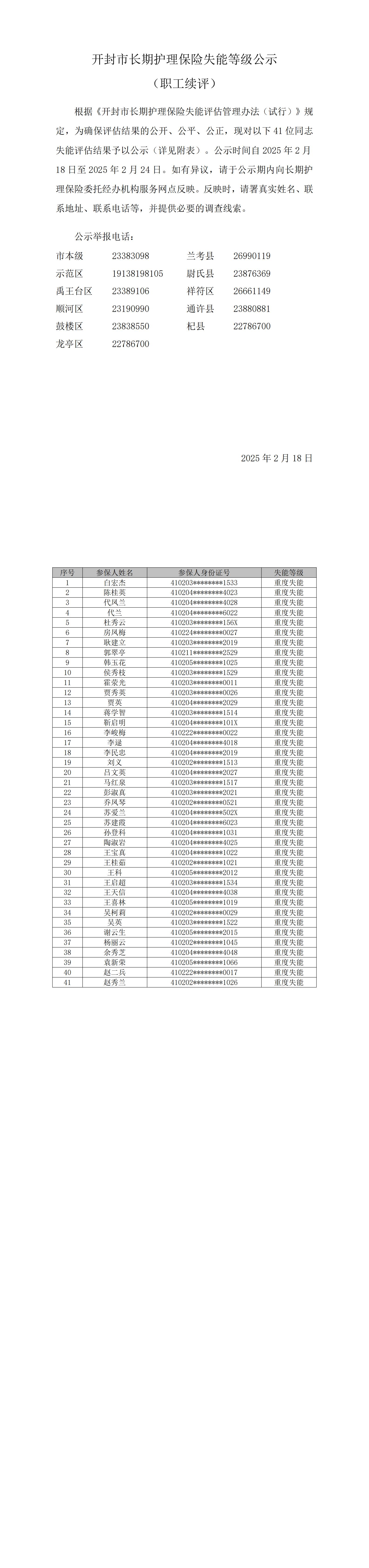 开封市长期护理保险失能等级公示(职工续评)--第98批