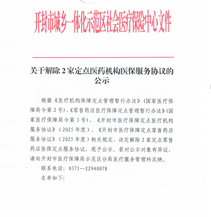 开封市城乡一体化示范区社会医疗保险中心关于解除2家定点医药机构医保服务协议的公示