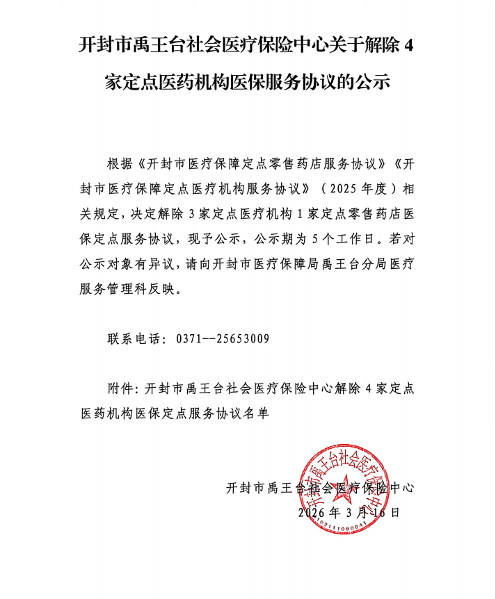 开封市禹王台社会医疗保险中心关于解除4家定点医药机构医保服务协议的公示