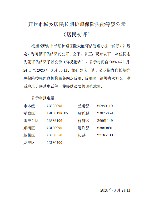 开封市城乡居民长期护理保险失能等级公示--第169批