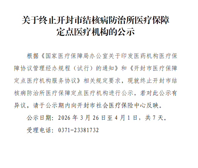 关于终止开封市结核病防治所医疗保障定点医疗机构的公示