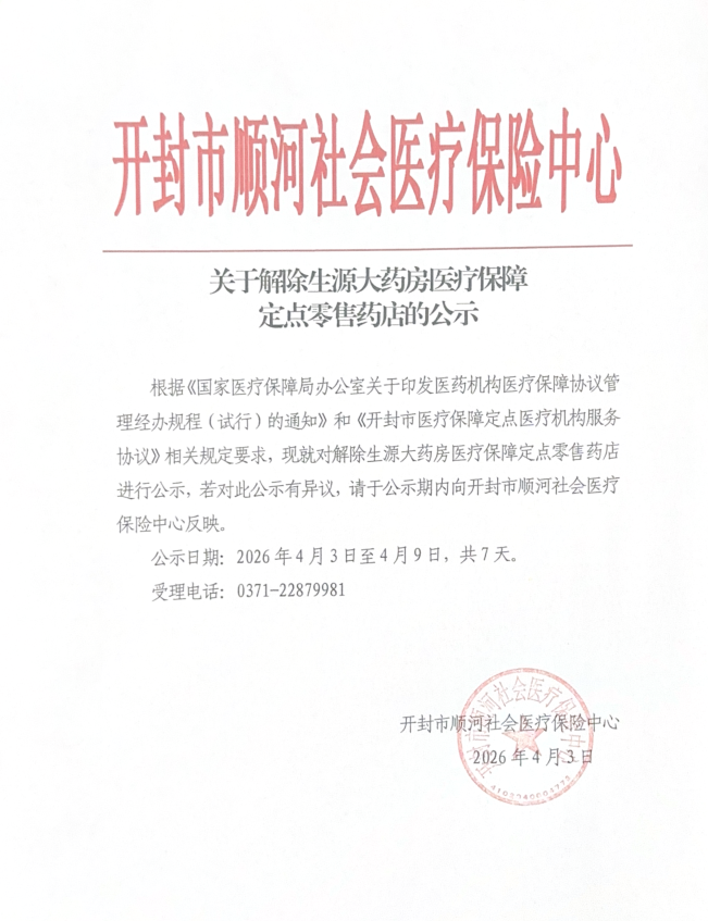 开封市顺河社会医疗保险中心关于解除生源大药房医疗保障定点零售药店的公示