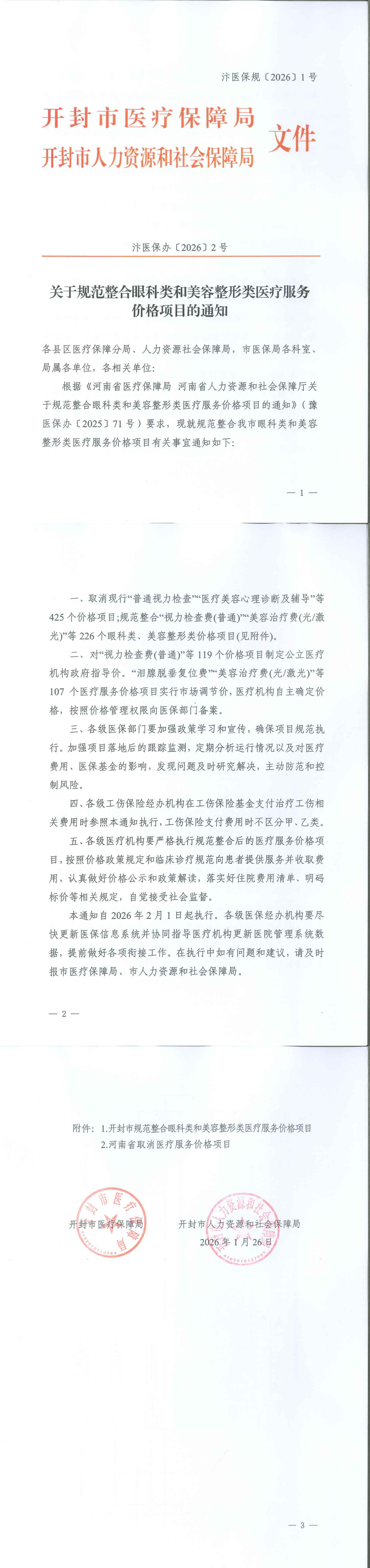 汴医保办2026 2 关于规范整合眼科类和美容整形类医疗服务价格项目的通知