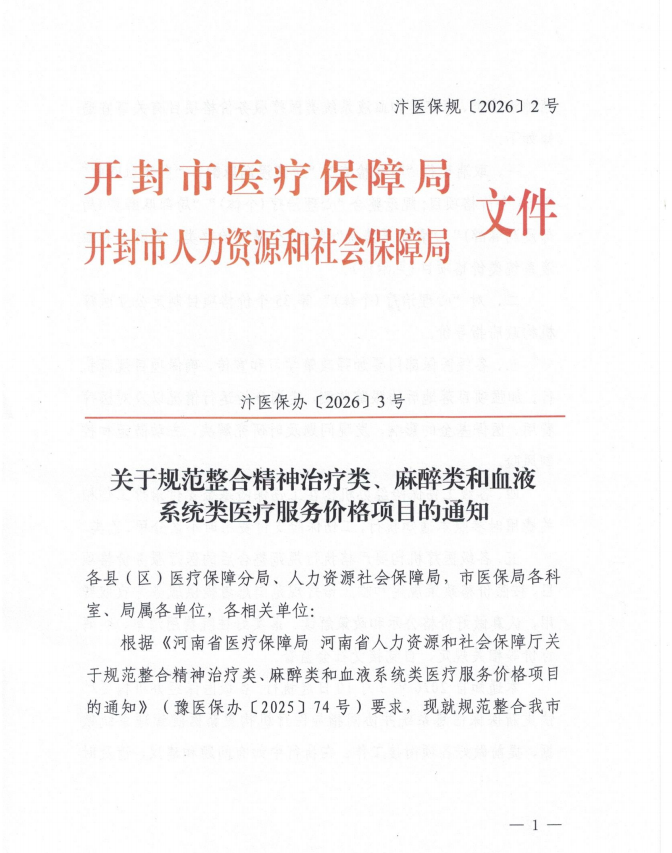 汴医保办2026 3号关于规范整合精神治疗类、麻醉类和血液系统类医疗服务价格项目的通知