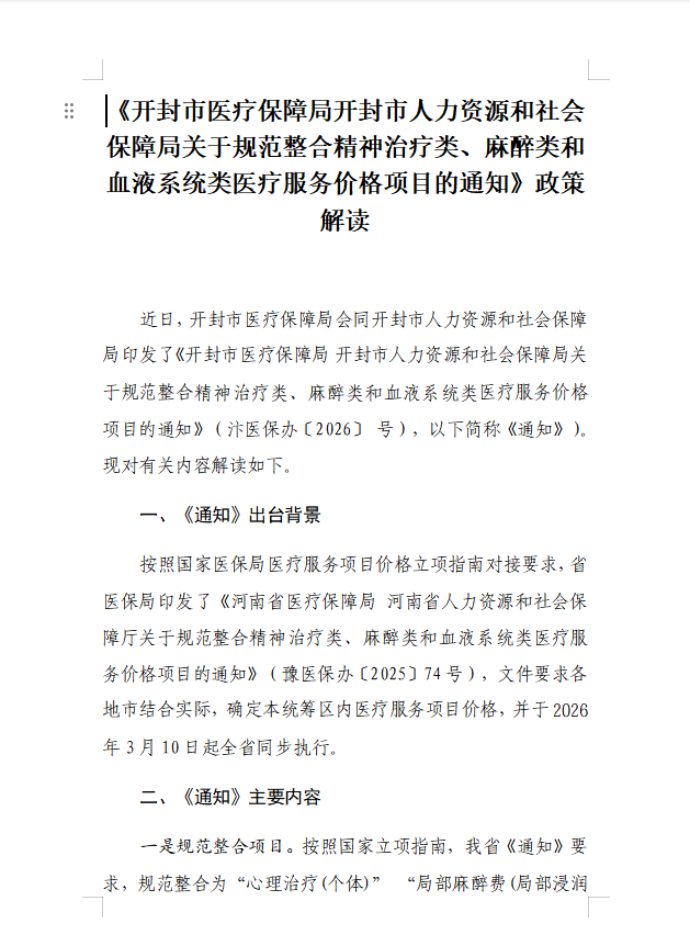 《开封市医疗保障局开封市人力资源和社会保障局关于规范整合精神治疗类、麻醉类和血液系统类医疗服务价格项目的通知》政策解读