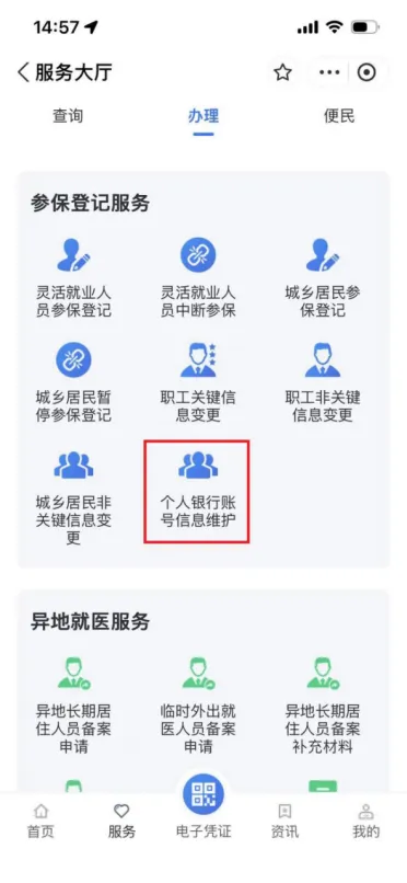 三、在“我要办”模块内找到“个人银行账号信息维护”