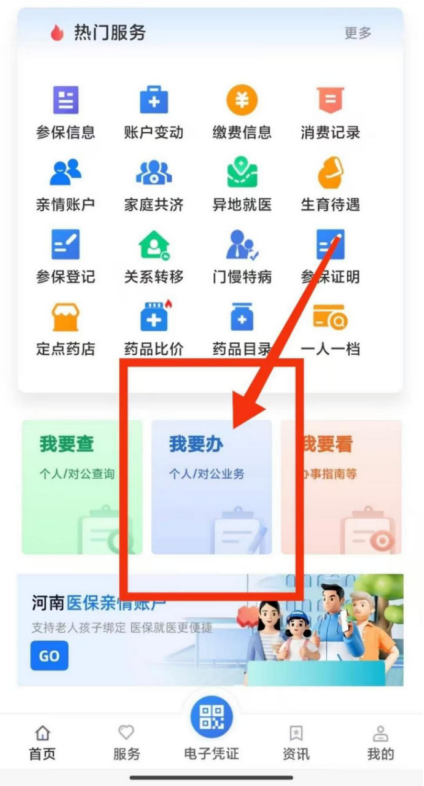 二、打开“河南医保”小程序,登录后点击进入“我要办”