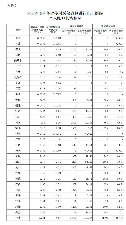 2025年6月,通过医保钱包转账方式进行职工医保个人账户省内、跨省共济共3.59万笔,转账金额2290.19万元;支付就医购药费用总计1.3万笔,支付金额219.21万元。从共济地域看,省内转账2.48万笔,转账金额1432.87万元;跨省转账1.11万笔,转账金额857.32万元。