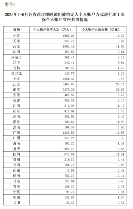 2025年1-6月,通过即时调用被绑定人个人账户方式进行职工医保个人账户省内共济的人次2.00亿,共济金额261.07亿元。