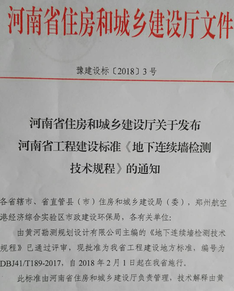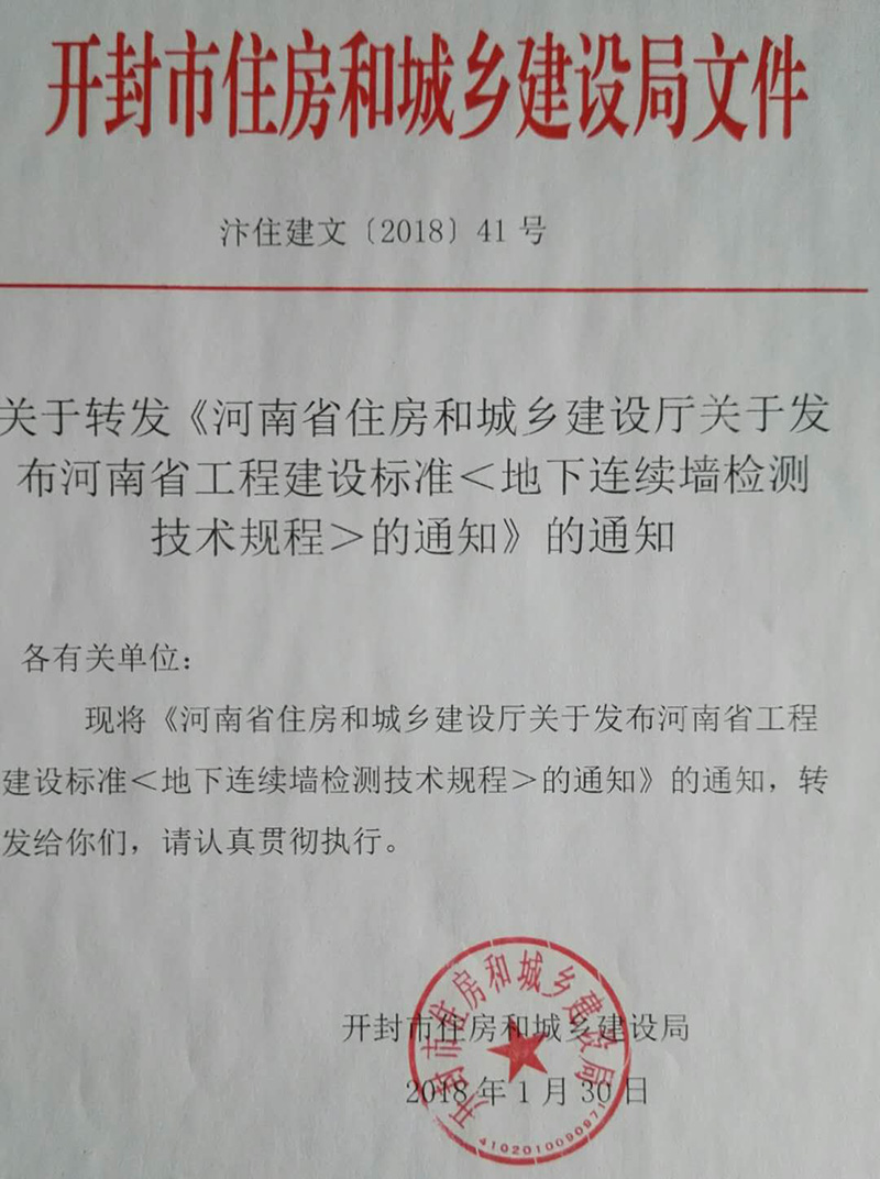 关于转发《河南省住房和城乡建设厅关于发布河南省工程建设标准〈地下连续墙检测技术规程〉的通知》的通知