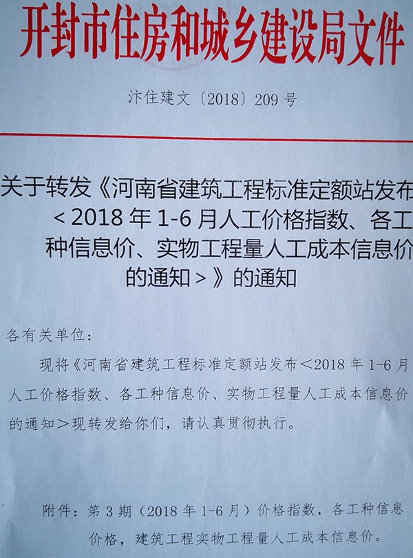 关于转发《河南省建筑工程标准定额站发布<2018年1-6月人工价格指数、各工种信息价、实物工程量人工成本信息价的通知的>》的通知