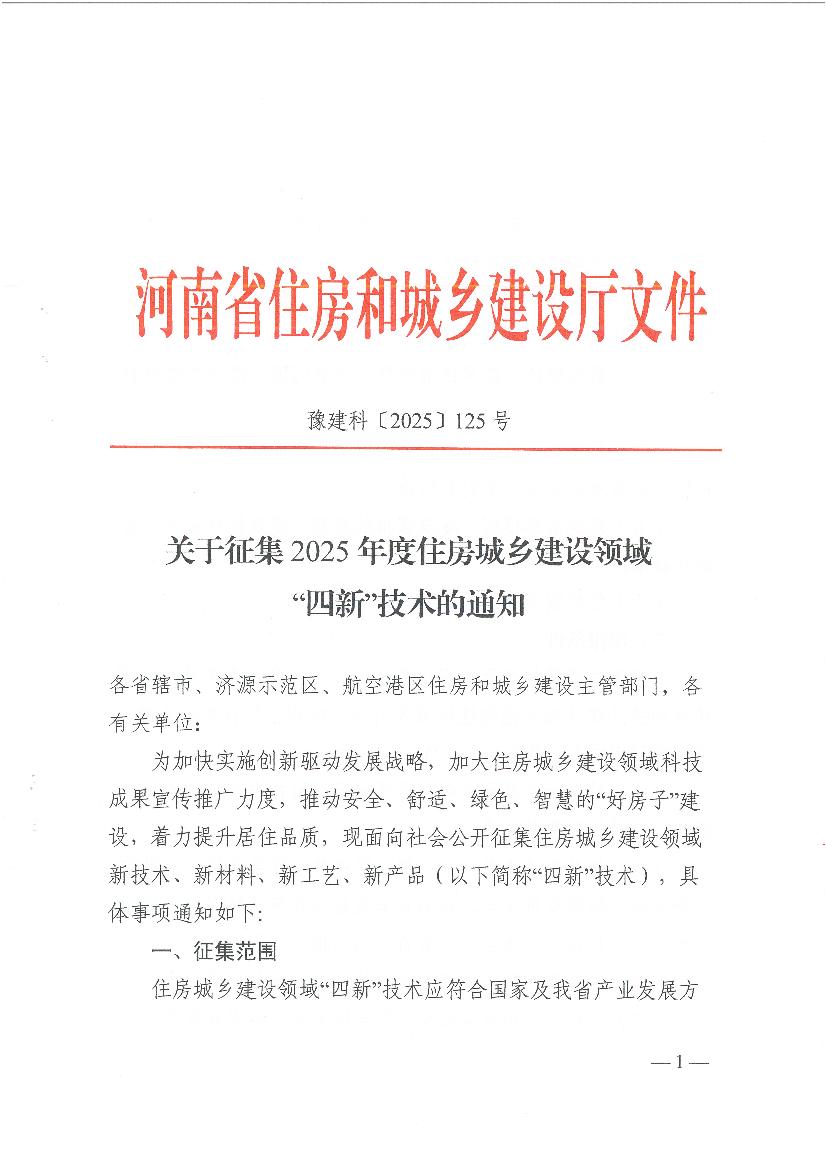河南省住建厅关于征集2025年度住房城乡建设领域“四新“技术的通知