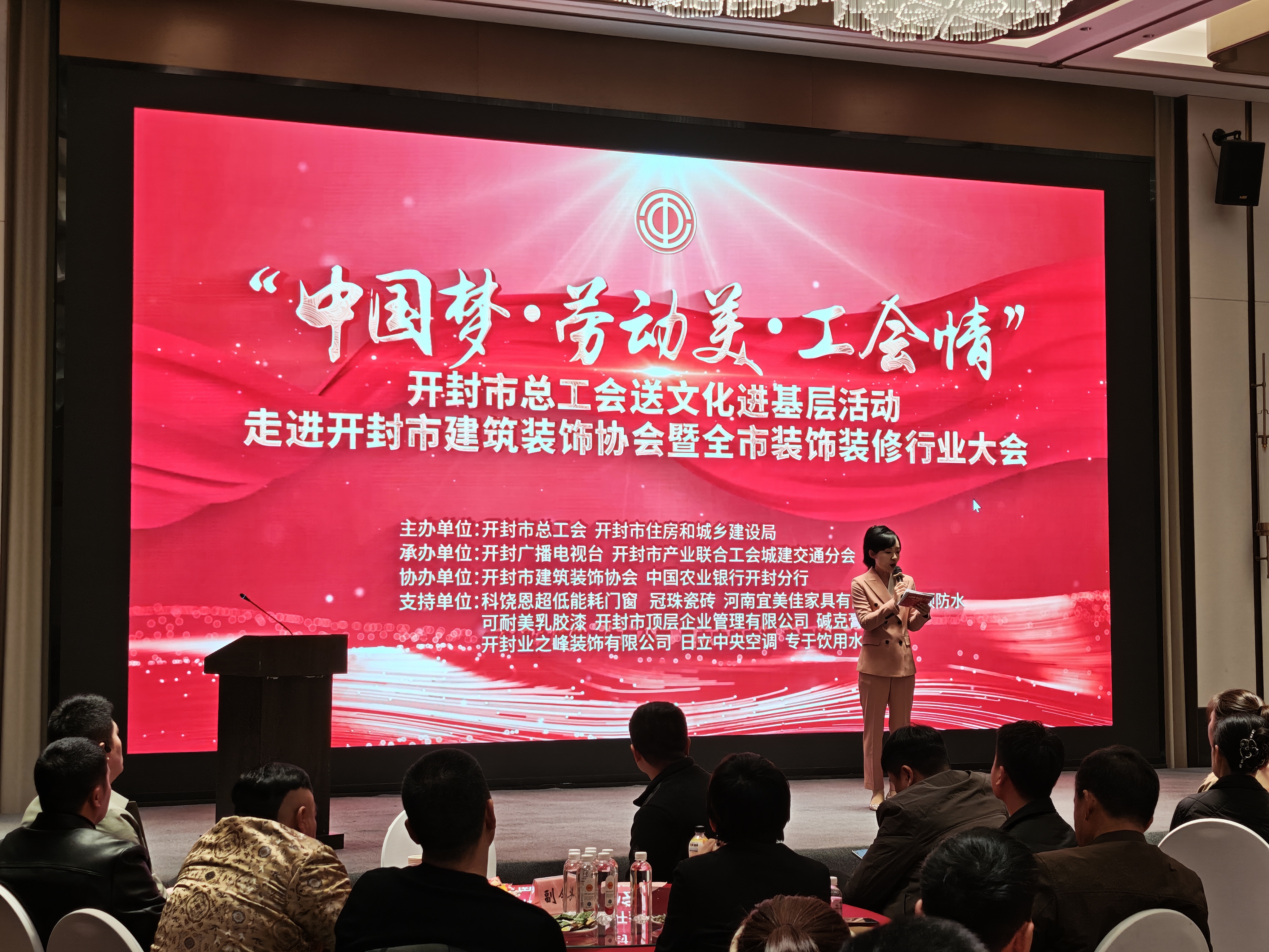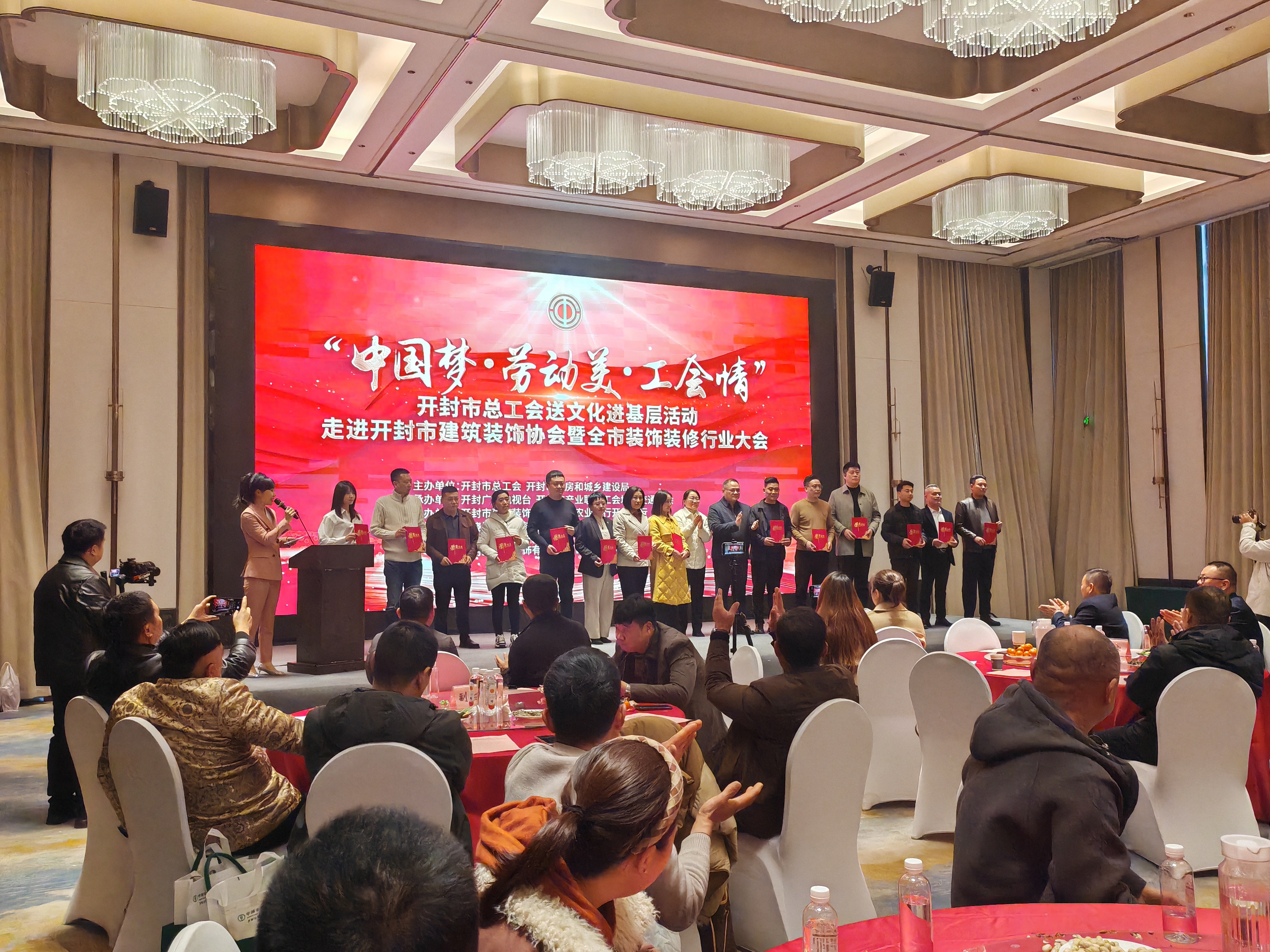 近日,由开封市总工会、开封市住房和城乡建设局联合主办的 “中国梦・劳动美・工会情” 送文化进基层活动暨开封市装饰装修行业大会顺利落幕。市总工会、市住房城乡建设局相关负责同志,市建筑装饰协会全体会员及行业职工代表齐聚一堂,共同参与了此次活动。